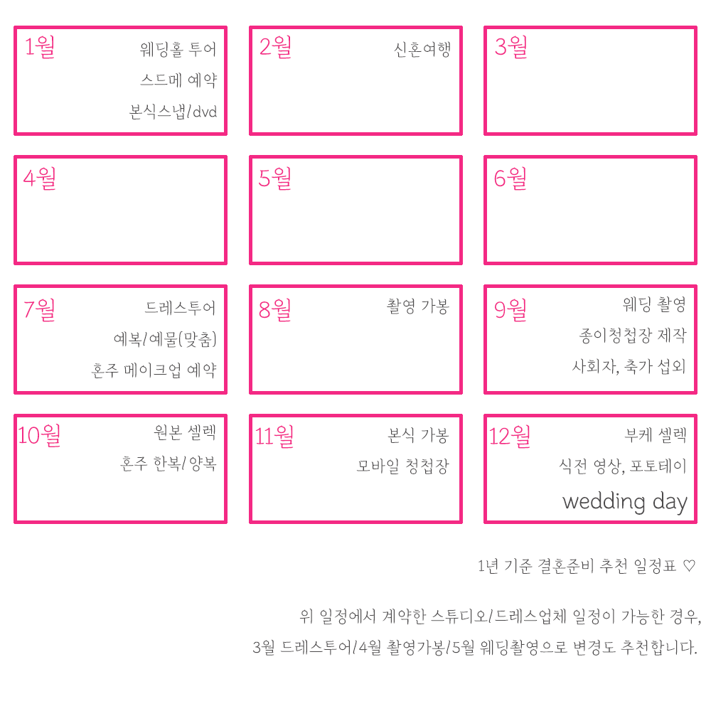 결혼 준비는 시간 관리가 매우 중요해요. 일반적으로 결혼식 6개월 전부터 준비를 시작하는 것이 좋고, 스드메는 예식 9개월 전부터 준비하는 것을 추천해요. 예를 들어, 1월에는 웨딩홀 예약과 드레스 선택을 하고, 2월에는 허니문 계획을 세우는 식으로 월별로 계획을 세우면 좋아요.